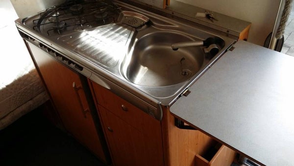 Midden chemisch cassettetoilet met wasbak.