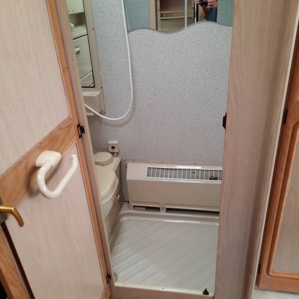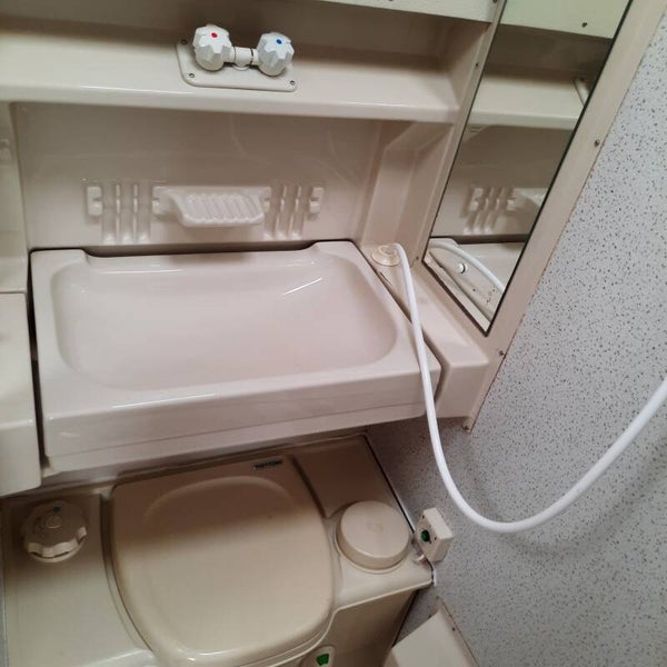 Toiletruimte met chemisch cassettetoilet, wasbak, douche.