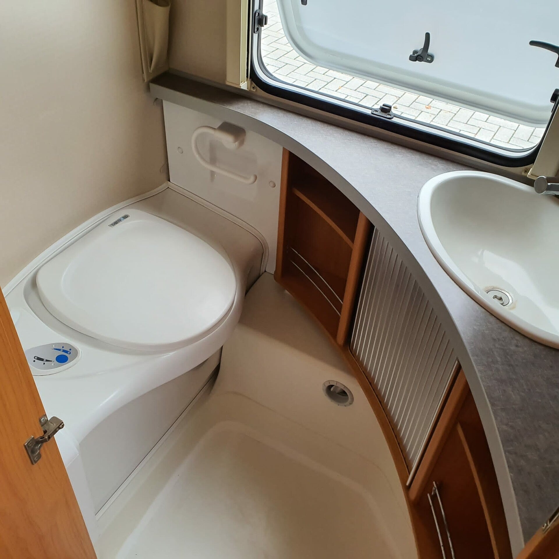Wasruimte met chemisch cassettetoilet en wasbak.