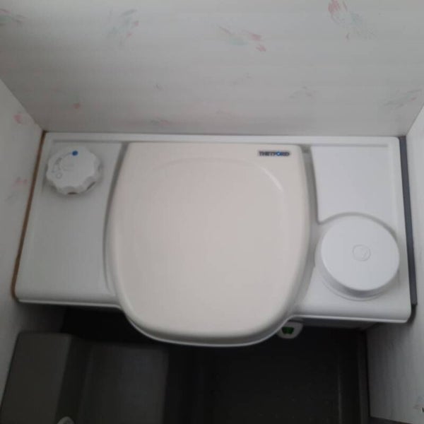 Midden wasruimte met wasbak en chemisch cassettetoilet.