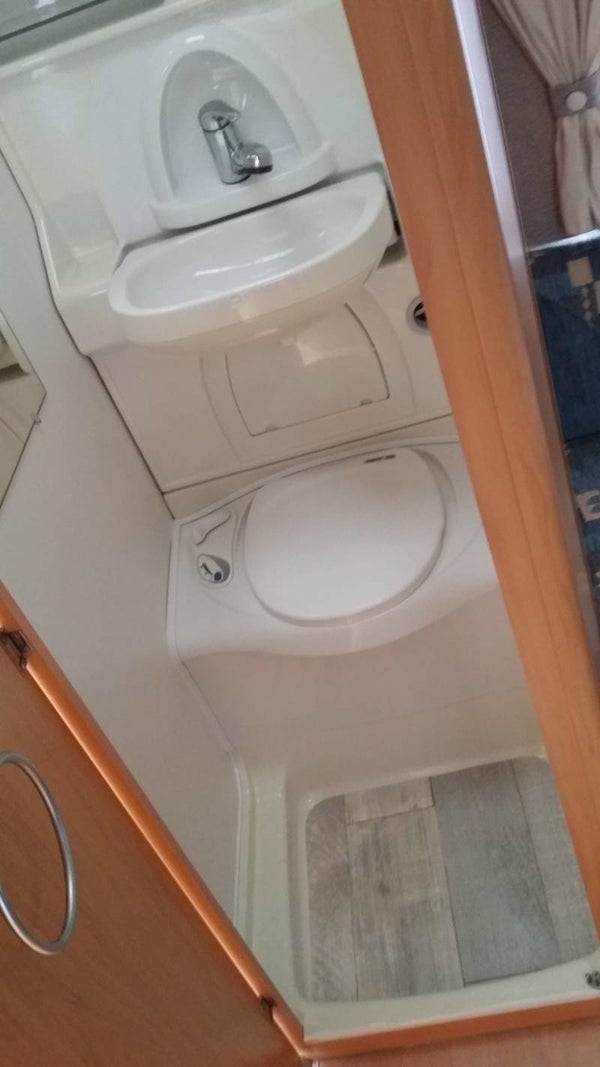 Achter wasruimte met chemisch cassettetoilet en wasbak warm/koud water.